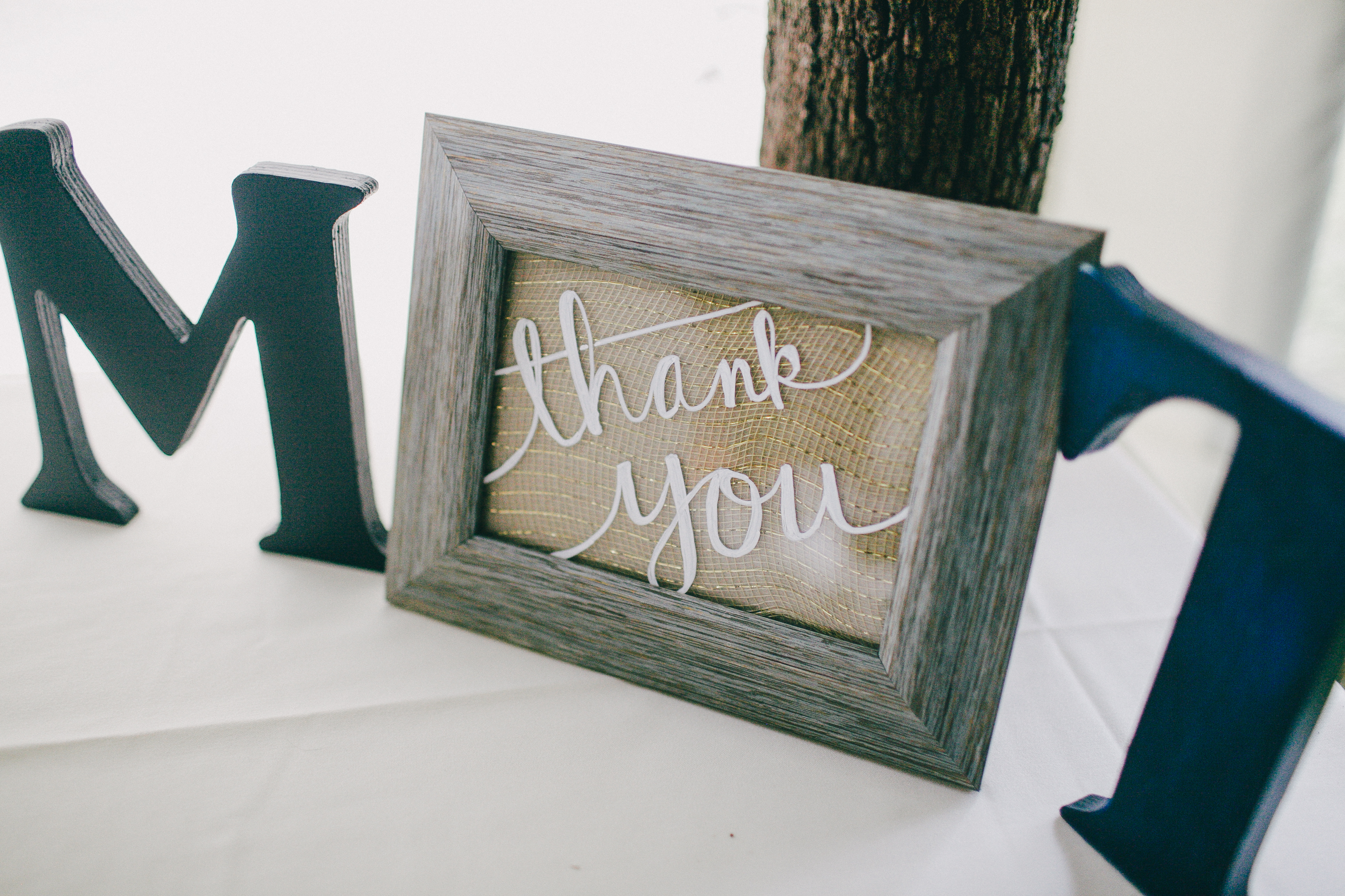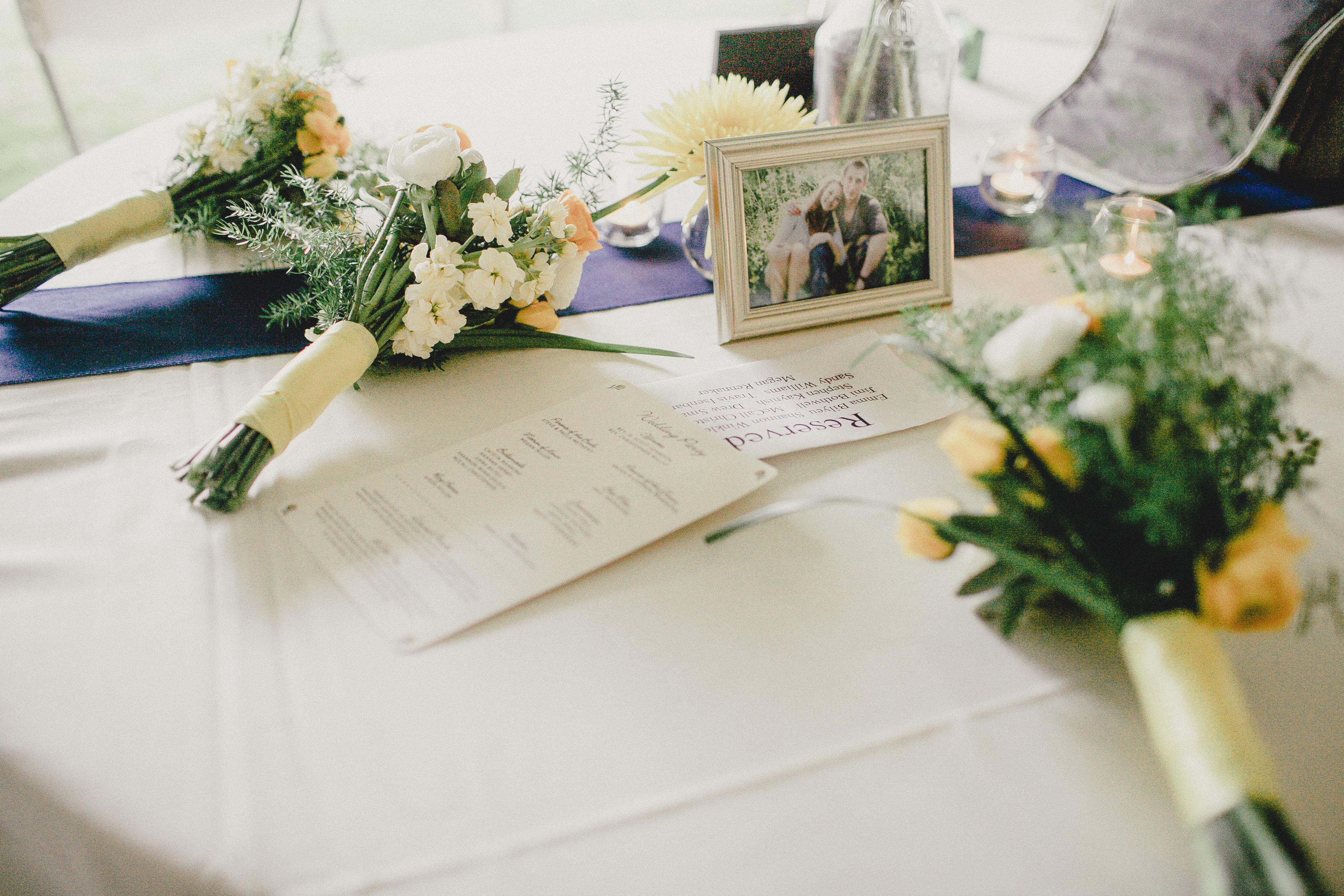 The rest of the decor was helped by our wedding planner. For the centerpieces, we had a collection of jars, bottles and votives on a navy runner and two dollar store frames with engagement photos in them. Also, some of the flowers that lined the aisle in the church were doubled as centerpieces. The lesson? Resourcefulness is a good thing.