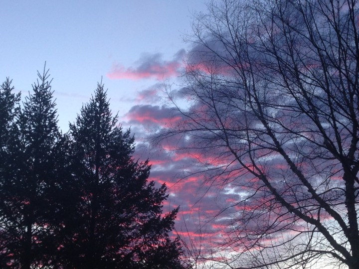 Still taking advantage of my non-work days, I’ve settled into a morning rhythm. After feeding the dogs, I make coffee (or heat it up from the previous morning), and I sit in the middle of the couch. It’s still dark, and I’m still tired, so I just sit. Directly in front of me, the window points to the sky that begins to lighten in ribbons, folding into vivid colors before the sun pops over the fence and nearly blinds me.